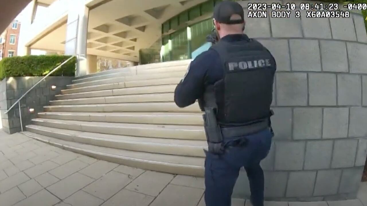 The footage shows the officers approaching the steps of the building, and gunfire can be heard.