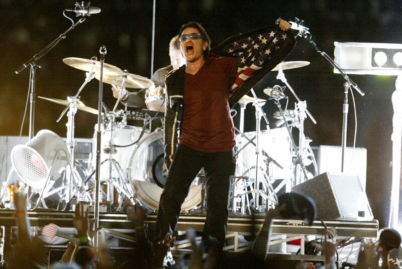 Super Bowl XXXVI 400517 09: Music group U2 performs during halftime of Super Bowl XXXVI February 3, 2002 at the Superdome in New Orleans, LA. Super Bowl XXXVI is being played by the New England Patriots and the St. Louis Rams. (Photo by Jed Jacobsohn/Getty Images) (Jed Jacobsohn/Getty Images)