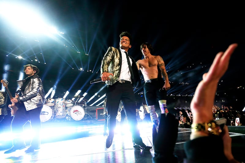 Pepsi Super Bowl XLVIII Halftime Show EAST RUTHERFORD, NJ - FEBRUARY 02: Bruno Mars and Anthony Kiedis of the Red Hot Chili Peppers perform during the Pepsi Super Bowl XLVIII Halftime Show at MetLife Stadium on February 2, 2014 in East Rutherford, New Jersey. (Photo by Jamie Squire/Getty Images) (Jamie Squire/Getty Images)