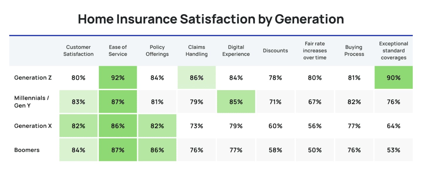 For home insurance, Gen Z reported the highest satisfaction with ease of service, exceptional standard coverages (90%), and claims handling: