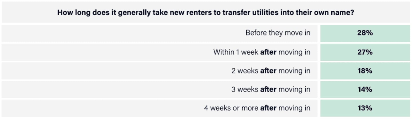 Utility transfer violations happen when a resident fails to transfer utilities into their name within required timeframes. When this happens, properties absorb that unit's utility costs until the violation is discovered. This is a common occurrence, with property managers reporting that 45% of residents take two or more weeks to transfer utilities into their name.