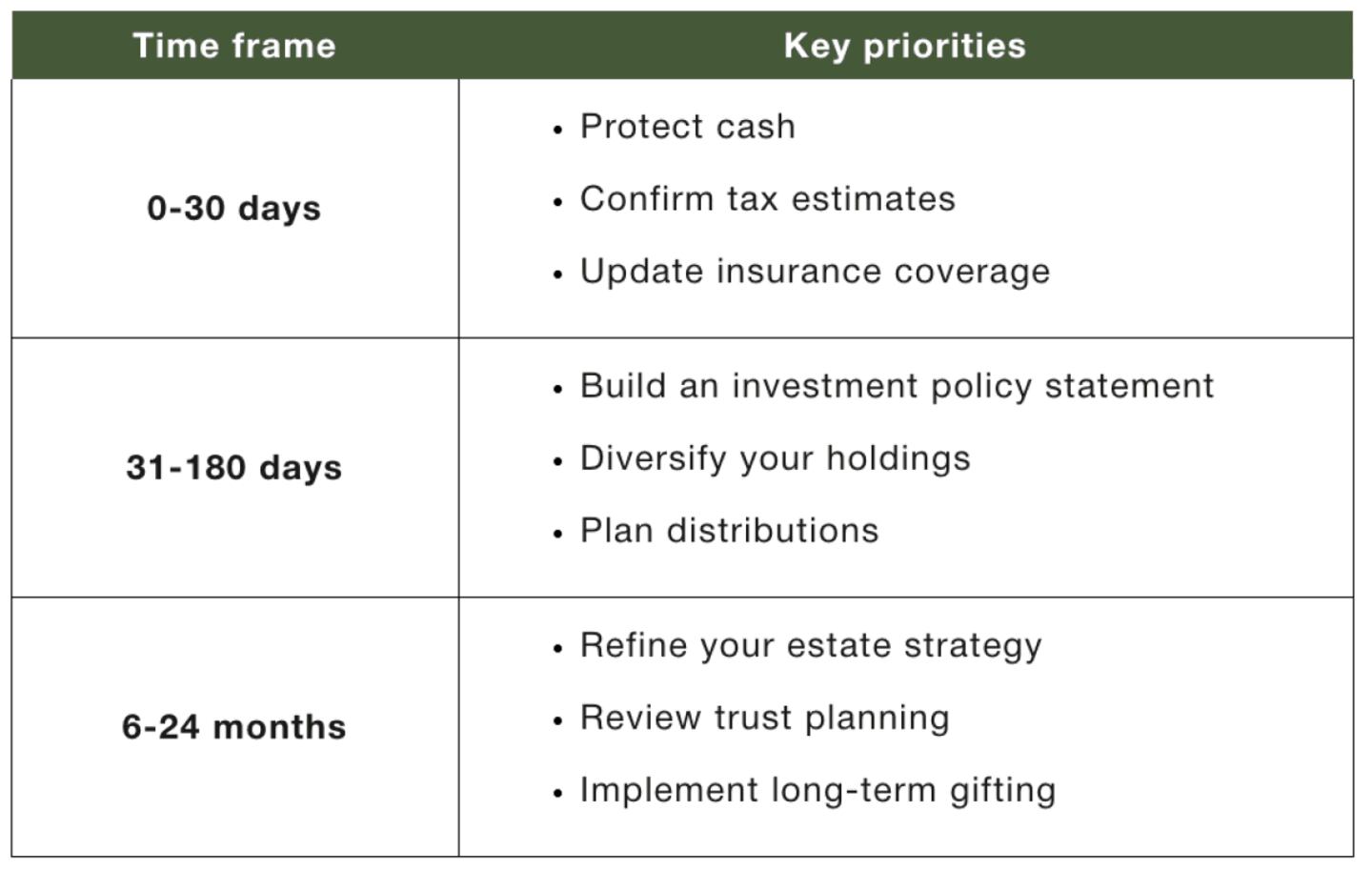 Although every exit is unique, this practical timeline can help you identify next steps: