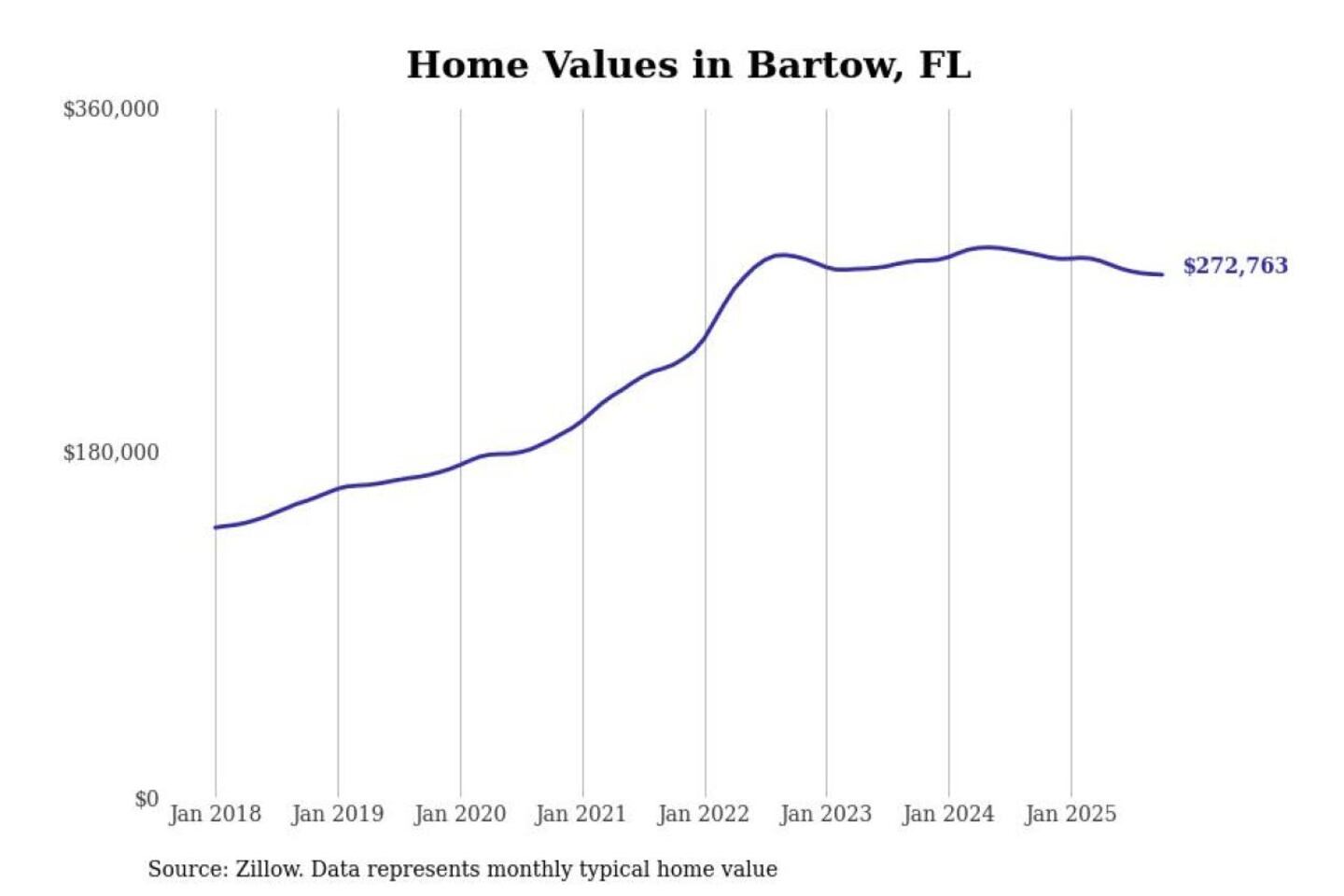Stacker compiled a list of cities with the most expensive homes in the Lakeland-Winter Haven, FL metro area using data from Zillow. Charts show the monthly typical home value since January 2018.