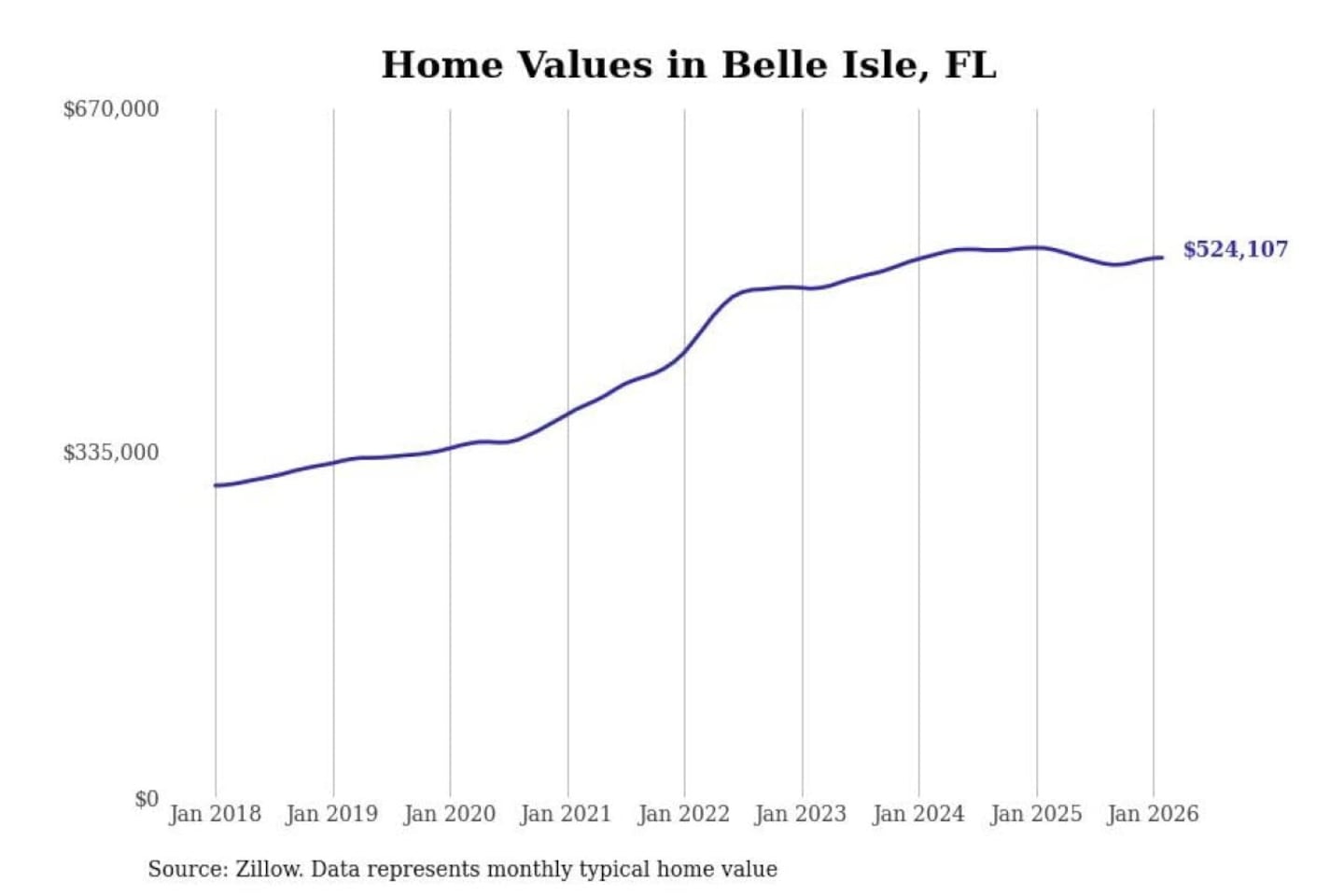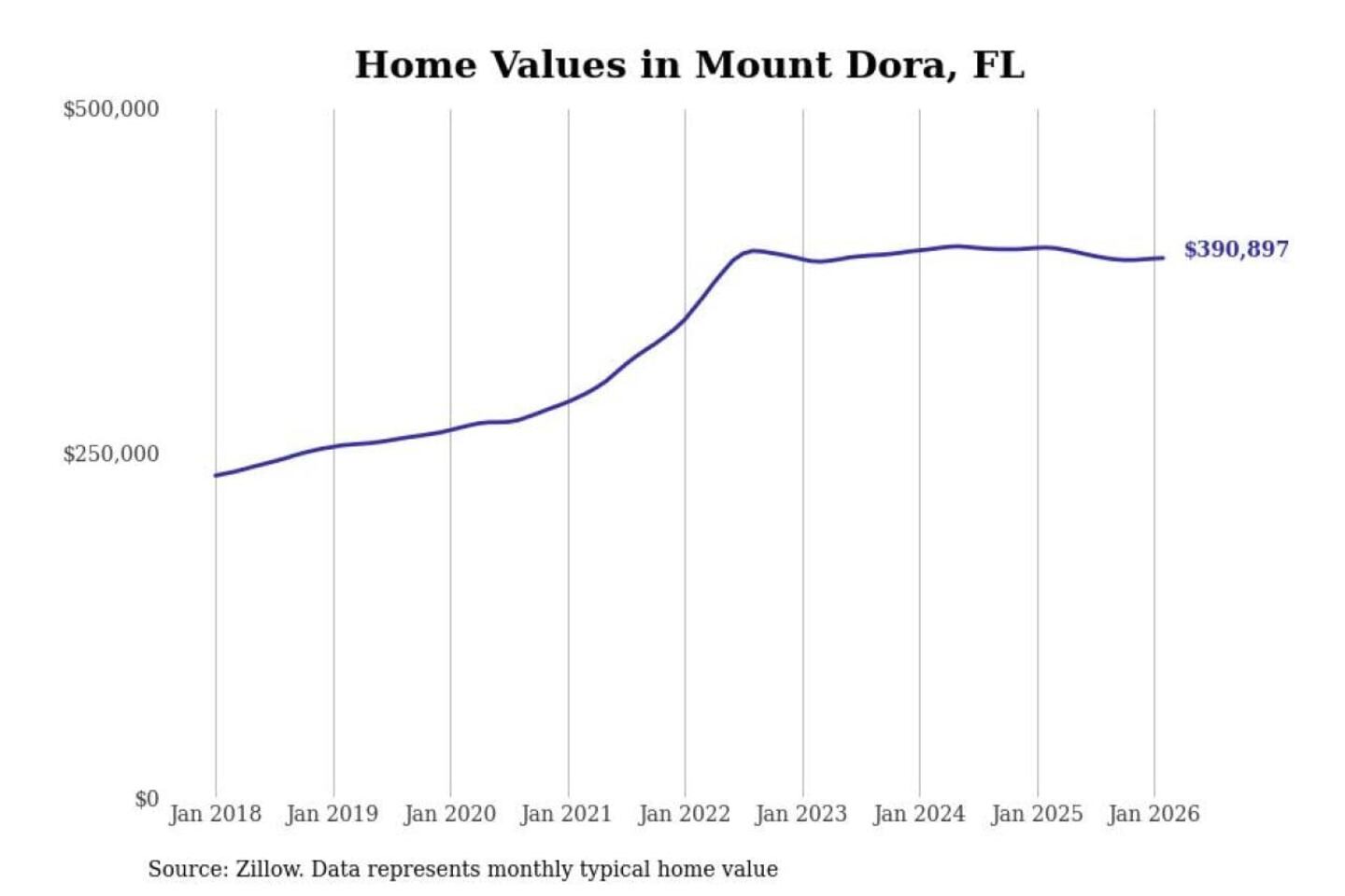 Stacker compiled a list of cities with the most expensive homes in the Orlando-Kissimmee-Sanford, FL metro area using data from Zillow. Charts show the monthly typical home value since January 2018.