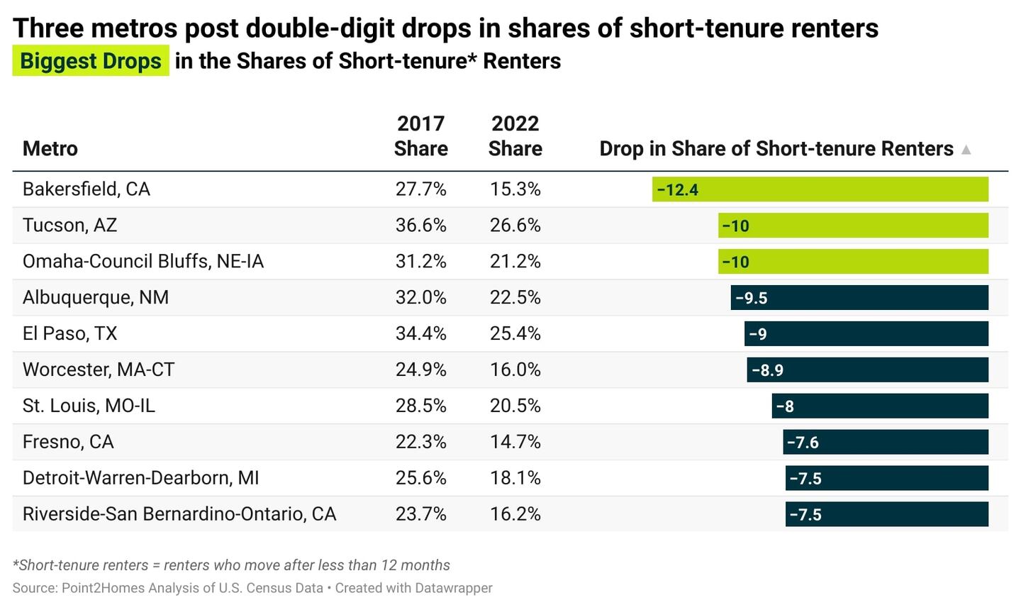 - The shares of renters who move after less than 12 months dropped the most in Bakersfield, California (-12.4%); followed by Tucson, Arizona (-10%); and Omaha, Nebraska-Council Bluffs, Iowa (-10%).
