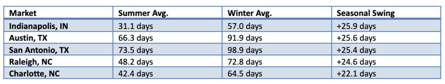 Indianapolis shows the most extreme pattern: Homes there sell nearly twice as fast during summer as they do in winter. Midwest and Southeast markets generally show larger seasonal swings.