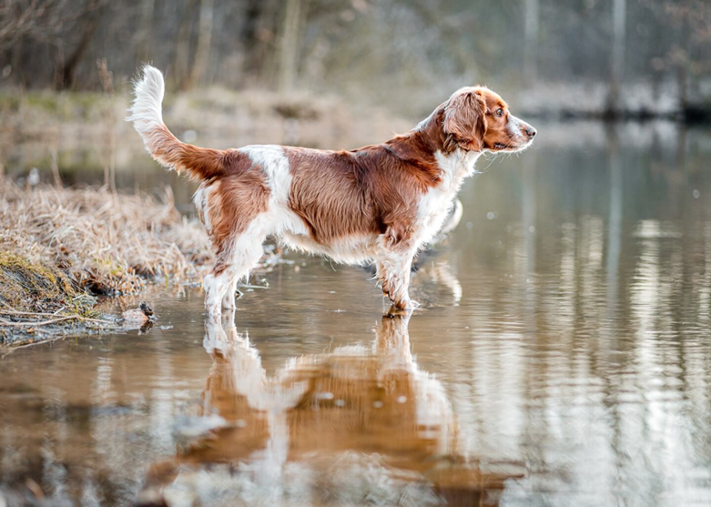 Weighing in at up to 55 pounds, the Welsh springer spaniel is a medium-sized hunting dog with a feathery red-and-white coat. The Welshie's trademark thick fur helps protect these canines from bad weather and thorny underbrush while on the hunt. Be warned, though, that owners will have to put in significant time and effort to keep that coat in tip-top shape.