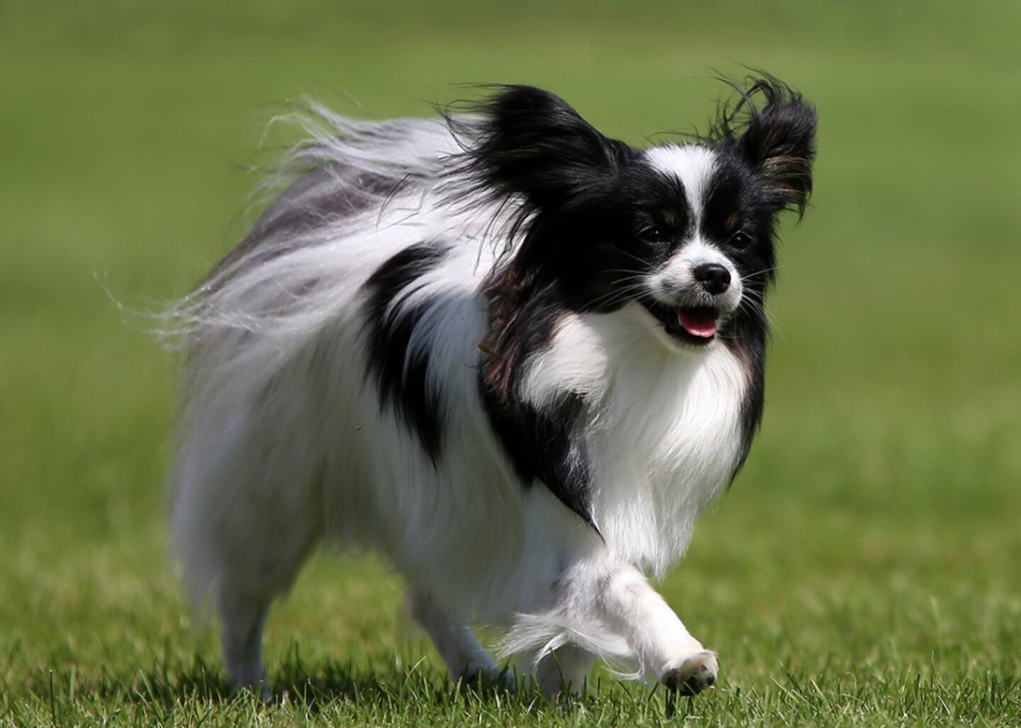 The Papillon's signature trait is its large feathered ears, which resemble a butterfly's wings: "Papillon" is the French word for butterfly. Despite standing just 8 to 11 inches tall, Papillons are highly athletic and love playing and running with their owners. The breed's versatility enables them to do well in all kinds of environments, whether on a farm in the countryside or in an apartment in a big city.