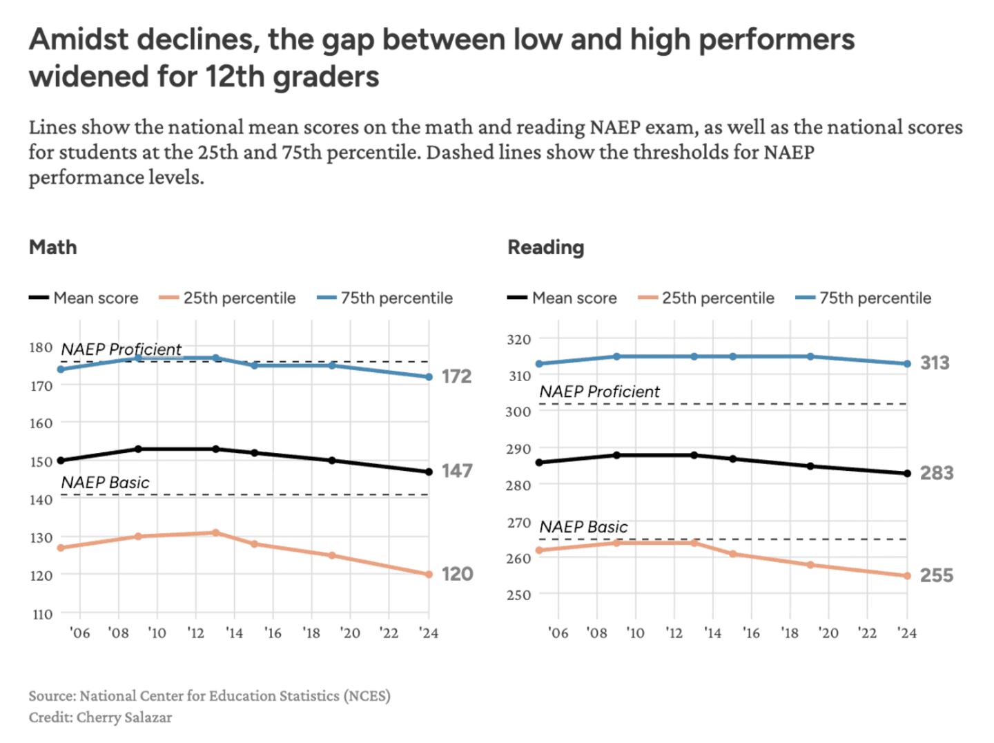 Results from the National Assessment of Educational Progress, or NAEP, released Sept. 2 show scores for 12th graders declined in math and reading for all but the highest performing students, as well as widening gaps between high and low performers in math. Chalkbeat reports that more than half of these students reported being accepted into a four-year college, but the test results indicate that many of them are not academically prepared for college, officials said.