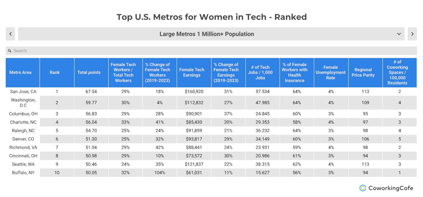The scoring system behind CoworkingCafe's annual Women in Tech series compares metro areas based on: the share of female workers in the local tech workforce; their earnings, unemployment and health insurance coverage rates; as well as broader metrics that gauge the broader professional landscape. However, to get a better perspective, the more than 200 metros in this analysis were divided into three population brackets—large, mid-sized and small.
