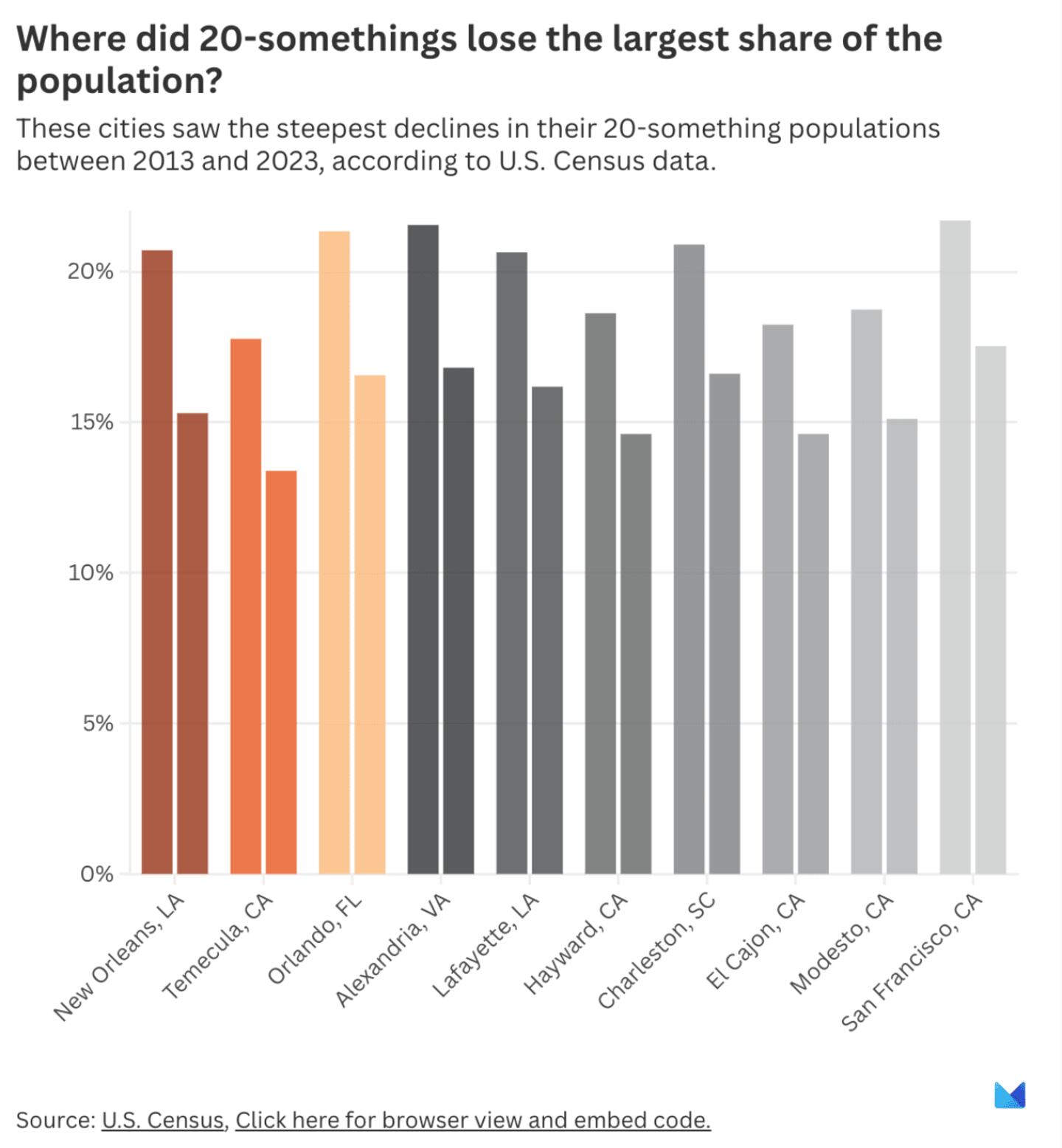 As in the top inbound cities, overall growth trends are tied to 20-somethings saying goodbye to American cities. Between 2018 and 2023, New Orleans lost about 7% of its population, but that number skyrocketed to 31% among 25-29-year-olds.