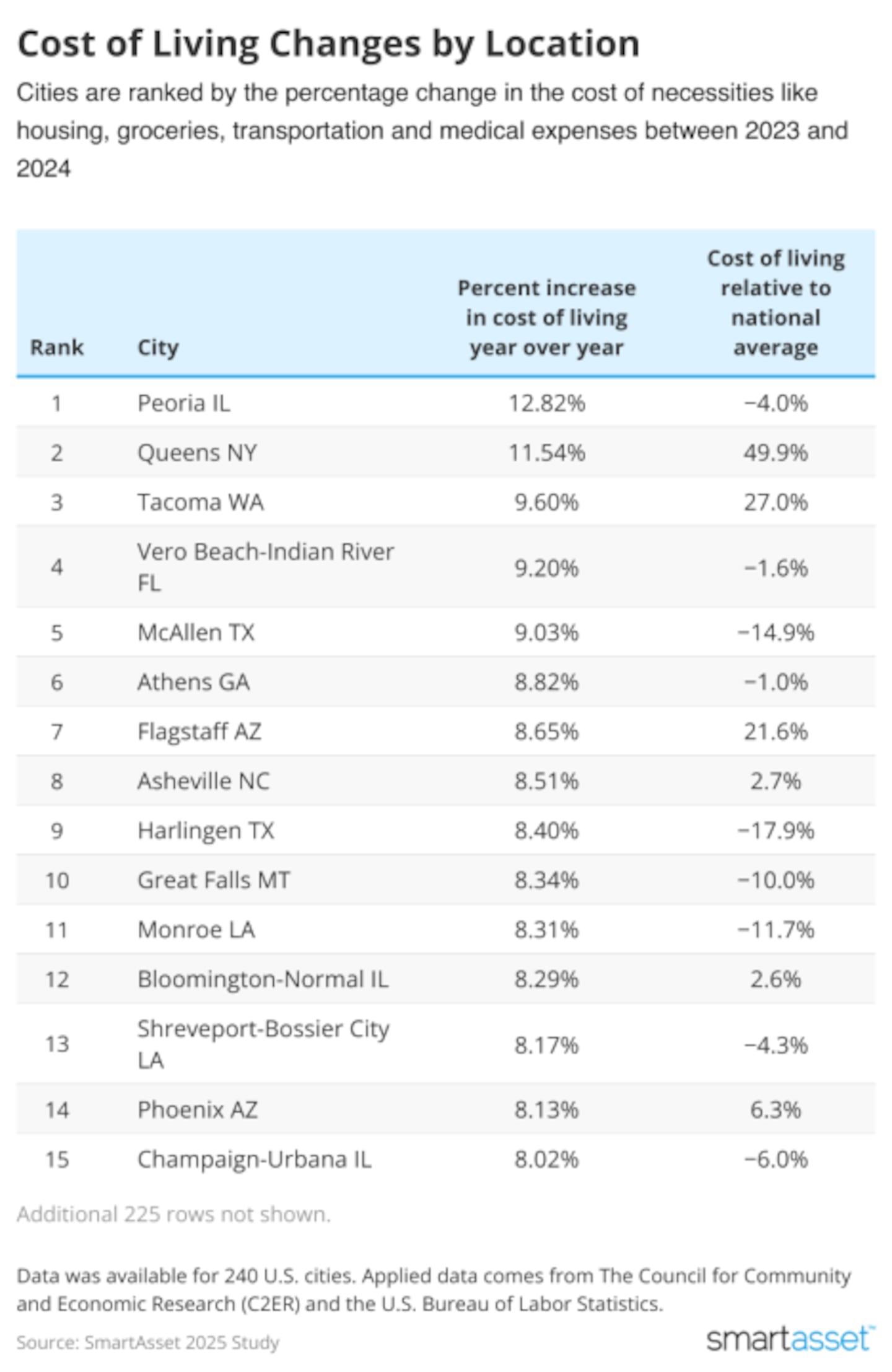 • The cost of living increased by over 10% in these two cities. Peoria, Illinois, saw the highest increase in cost of living at 12.8%. Peoria previously enjoyed a significantly lower cost of living than average, but those costs are quickly rising. Queens, New York, also saw an 11.5% increase in the cost of living, which now makes it about 50% more expensive than the average U.S. city.