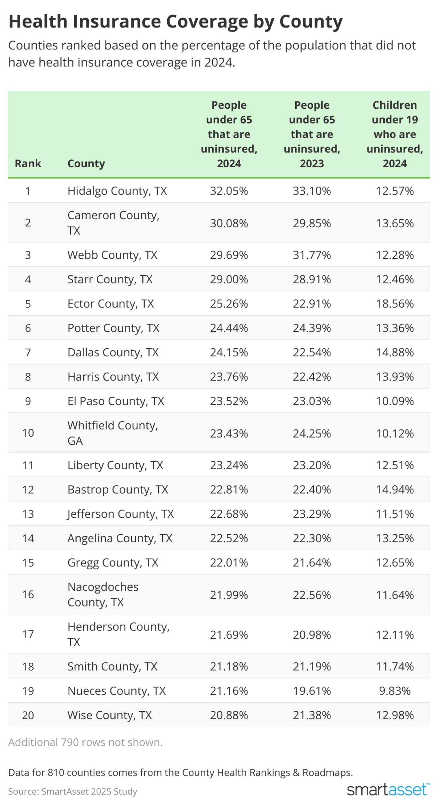 • These Texas counties have the lowest rates of health insurance coverage nationwide. More than any other county, 32% of residents in Hidalgo County don't have health insurance. Cameron County (30.1% uninsured), Webb County (29.7%), Starr County (29%), Ector County (25.3%), Potter County (24.4%), Dallas County (24.2%), Harris County (23.8%), and El Paso County (23.5%) are also among the top 10 uninsured counties nationwide.